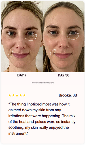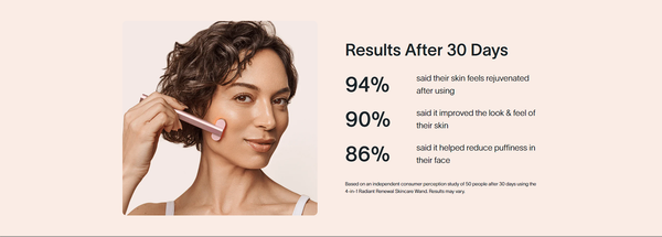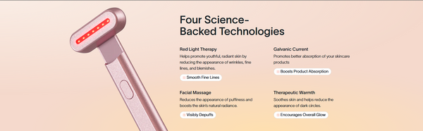 Reduce the appearance of wrinkles, fine lines, dark circles, blemishes, and dark spots with our award-winning Wand that uses Red Light Therapy, Galvanic Current, Facial Massage, and Therapeutic Warmth.